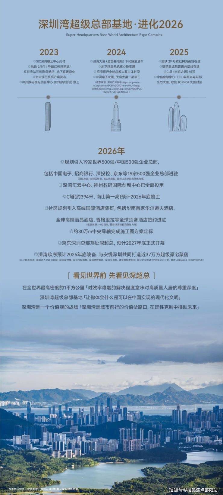深圳湾超级总部基地,位于约15km滨海长廊核心,基于“一心双核、十字生境”空间布局和超级生态融合的顶层规划,聚合总部经济引擎、顶奢酒店配套、高端豪宅及壮丽海景,澎湃世界潮汐,共栖时代山海,成就深圳超核海岸坐标。(信息来源:《深圳湾超级总部基地控制性详细规划》、《深圳湾超级总部基地城市设计优化》)