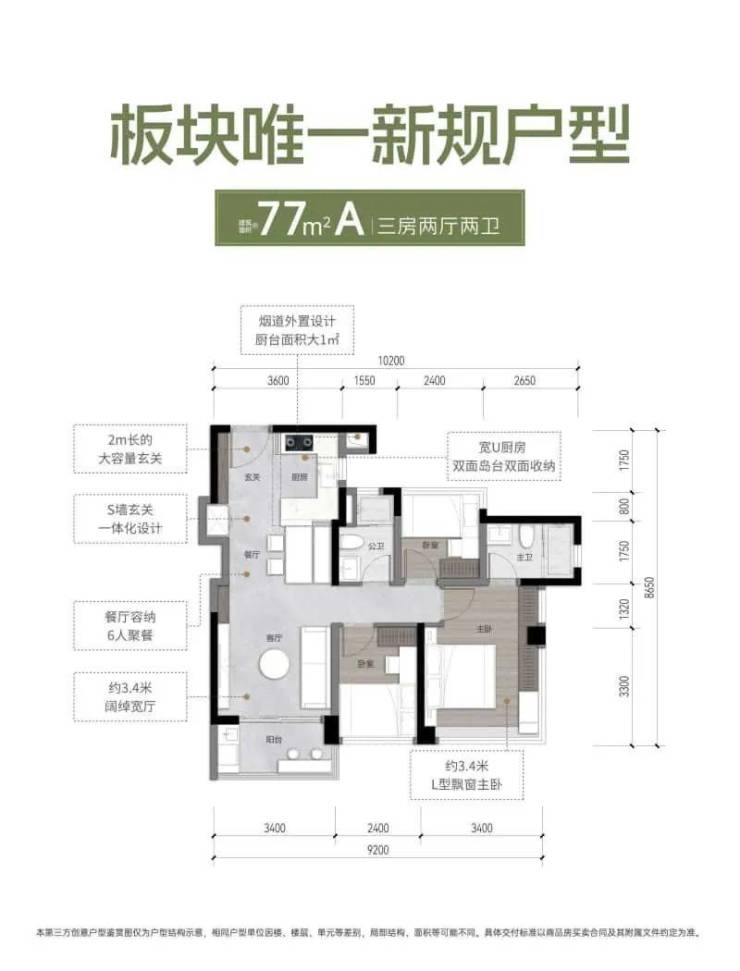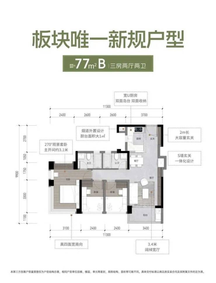 这个户型是项目的入门款,总价190万起就能拿下三房,对于年轻家庭或投资客来说,性价比极高。不过供应量不多,估计要靠抢。