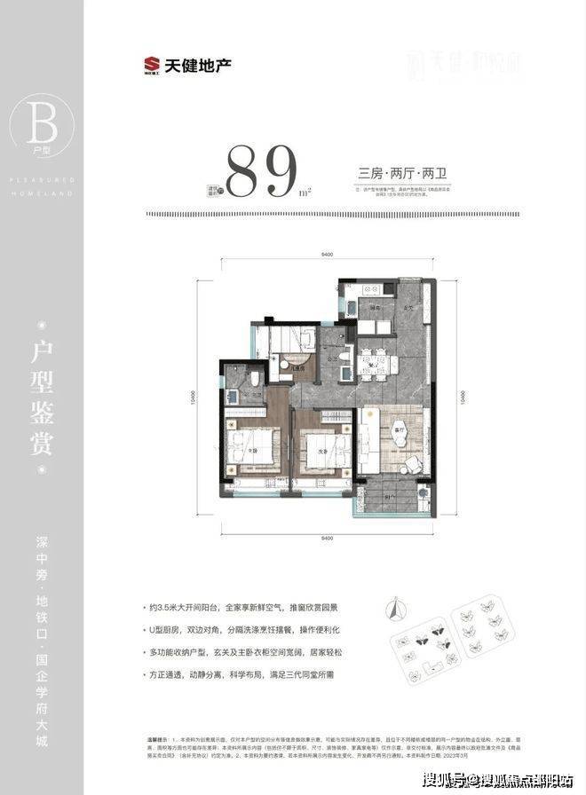 89㎡的3房2厅2卫,设计的是经典竖厅格局,进门入户玄关,客厅实测3.29米开间,客餐厅实测约20.62㎡,三开间朝南,动静分区,分别做到了主卧12.13㎡/次卧9.78㎡/次卧6.06㎡(实测面积,去掉墙体),U型厨房,公卫三段式分离,得房率81.3%(不含赠送),阳台4.65㎡西南或东南朝向。赠送面积约7.5㎡,加上赠送后得房率约89.72%。