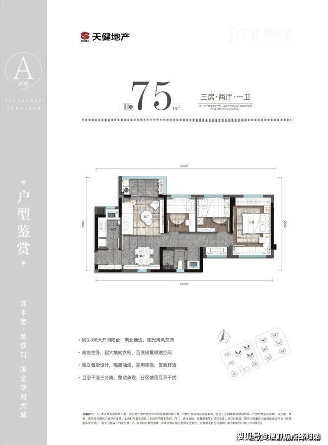 75㎡的3房2厅1卫,设计的是竖厅南北通透格局,进门入户玄关,客厅实测3.18米开间,客餐厅实测约16.75㎡,分别做到了主卧13.08㎡/次卧6.41㎡/次卧5.66㎡(实测面积,去掉墙体),L型厨房,卫生间三段式分离,得房率81.3%(不含赠送),阳台4.29㎡西北或东北朝向。赠送面积约10㎡,加上赠送后得房率约94.62%。