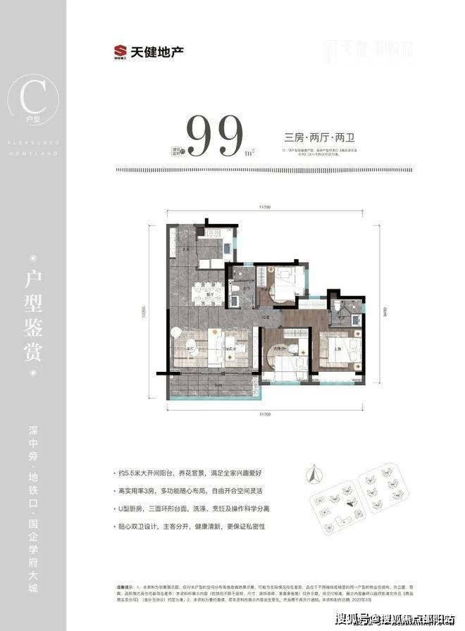 99㎡的3房2厅2卫,设计的是经典竖厅格局,可以改4房的户型,进门入户玄关,客厅实测5.25米开间,客餐厅实测19.67㎡,三开间朝南,动静分区,分别做到了主卧13.53㎡/次卧9.07㎡/次卧6.56㎡(实测面积,去掉墙体),U型厨房,公卫三段式分离,得房率81.7%(不含赠送),阳台实测5.1米长约7.15㎡西南朝向。赠送面积约9.5㎡,加上赠送后得房率约91.3%。