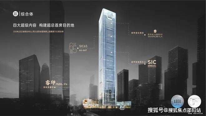 集商业、酒店、办公、SIC65四大旗舰业态,构建超总首席目的地358米LEED金级&WELL双认证的地铁上盖TOD综合体