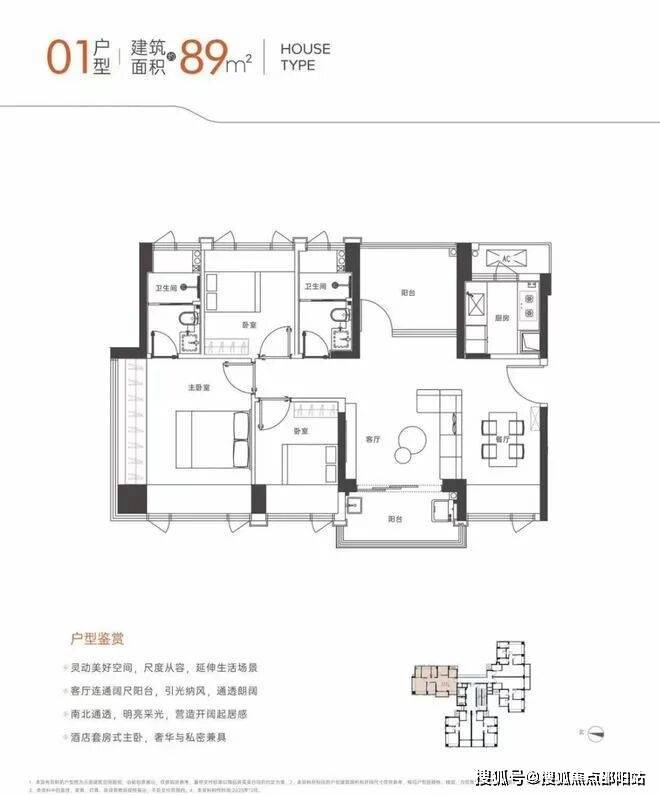 建面约:89㎡4房2卫通透,西南朝向