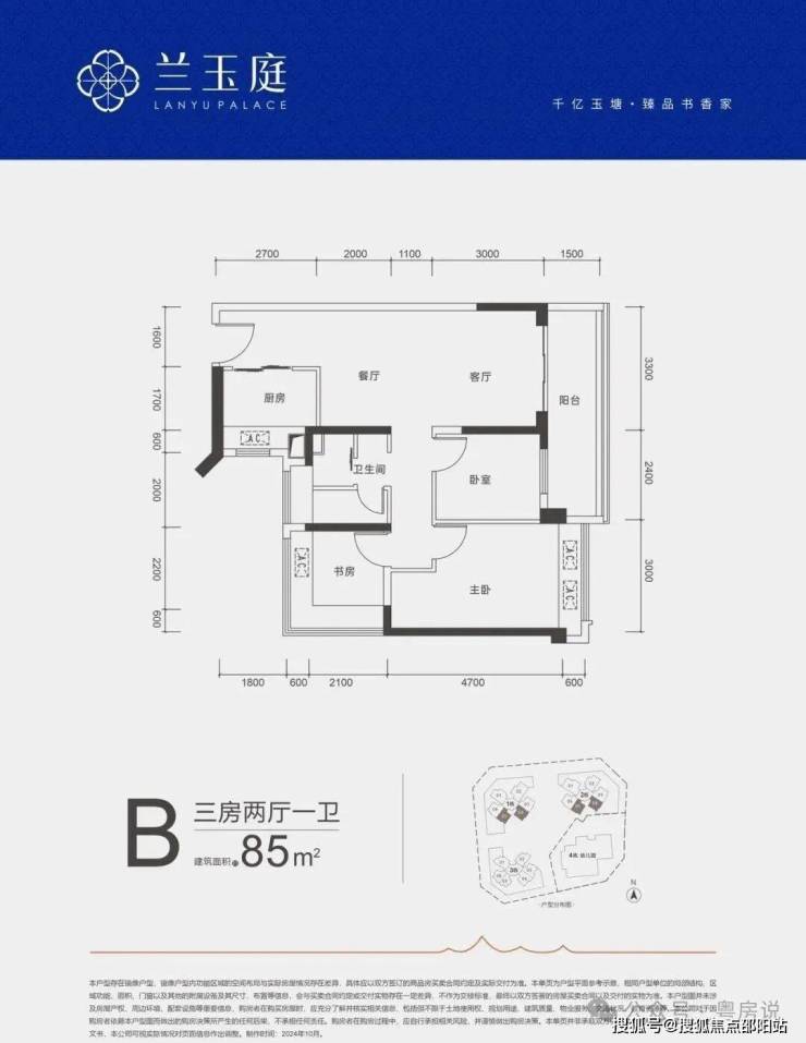 85㎡的3房2厅1卫,B户型,设计的是竖厅格局,客厅开间3.3米,LDKB一体化,三开间朝南,3个卧室分别做到了3米/2.7米/2.4米的宽度,客厅连接次卧出5.7米长的大阳台,L型厨房,创新式三分离卫生间,得房率约79%(不含赠送),西南或东南朝向。