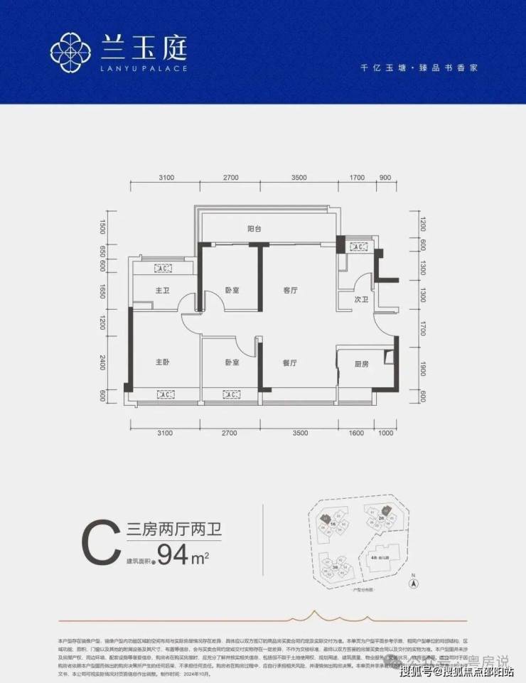 94㎡的3房2厅2卫,C户型,设计的是竖厅南北通透格局,客厅开间3.5米,3个卧室分别做到了3.1米/2.7米/2.7米的宽度,客厅连接次卧出6.2米长的大阳台,U型厨房,公卫三段式分离,得房率约79%(不含赠送),阳台主朝西北或东北向。