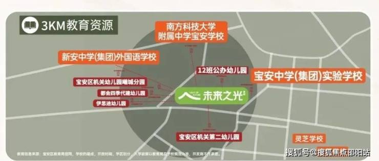 项目内自建幼儿园,3km内南方科技大学附属中学宝安学校(在建中)、宝安中学(集团)实验学校、新安中学(集团)外国语学校、曦城协同学校等学府汇聚