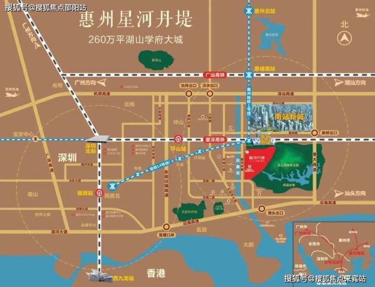 该项目位于惠阳与大亚湾交界处,位置属于三城中央。厦深高铁惠州南站的开通使得项目成为深圳城轨的第一站,地理位置优越。同时,该项目兼具惠阳成熟的配套和大亚湾的高起点规划,实现了多维度的发展。