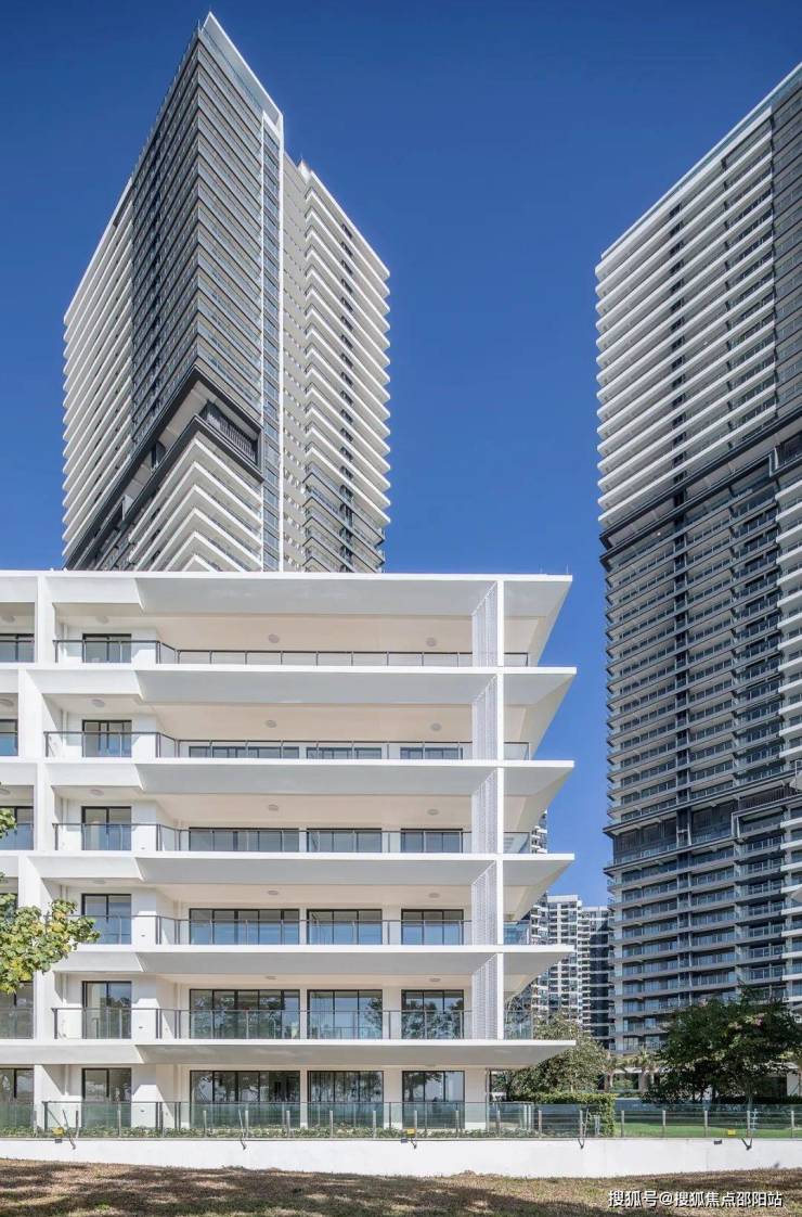 立面上的横向线条作为项目的统一元素,强化了塔楼间的整体性,勾勒出时尚轻盈的极简建筑形象。白色飘板形成的明面与灰色涂料形成的暗面形成自然的对比,打造立面丰富的韵律感。
