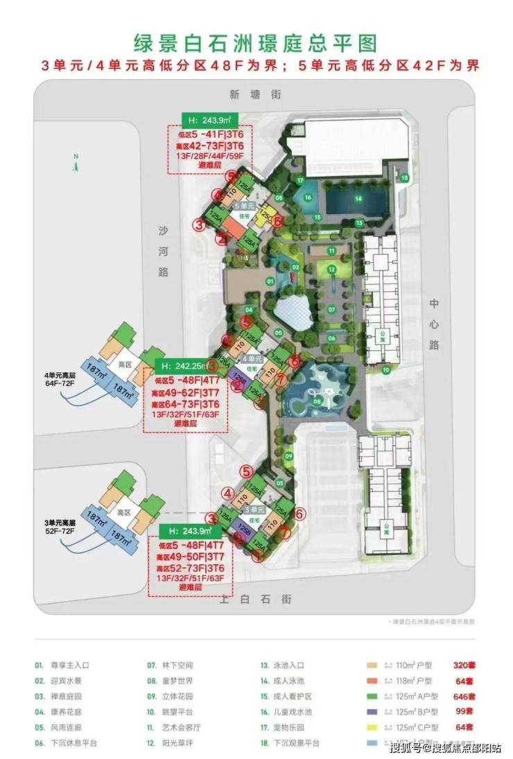 梯户比:住宅48楼以下低区4梯7户,高区3梯6户,公寓:南段3梯4户,中段/北段3梯8户。