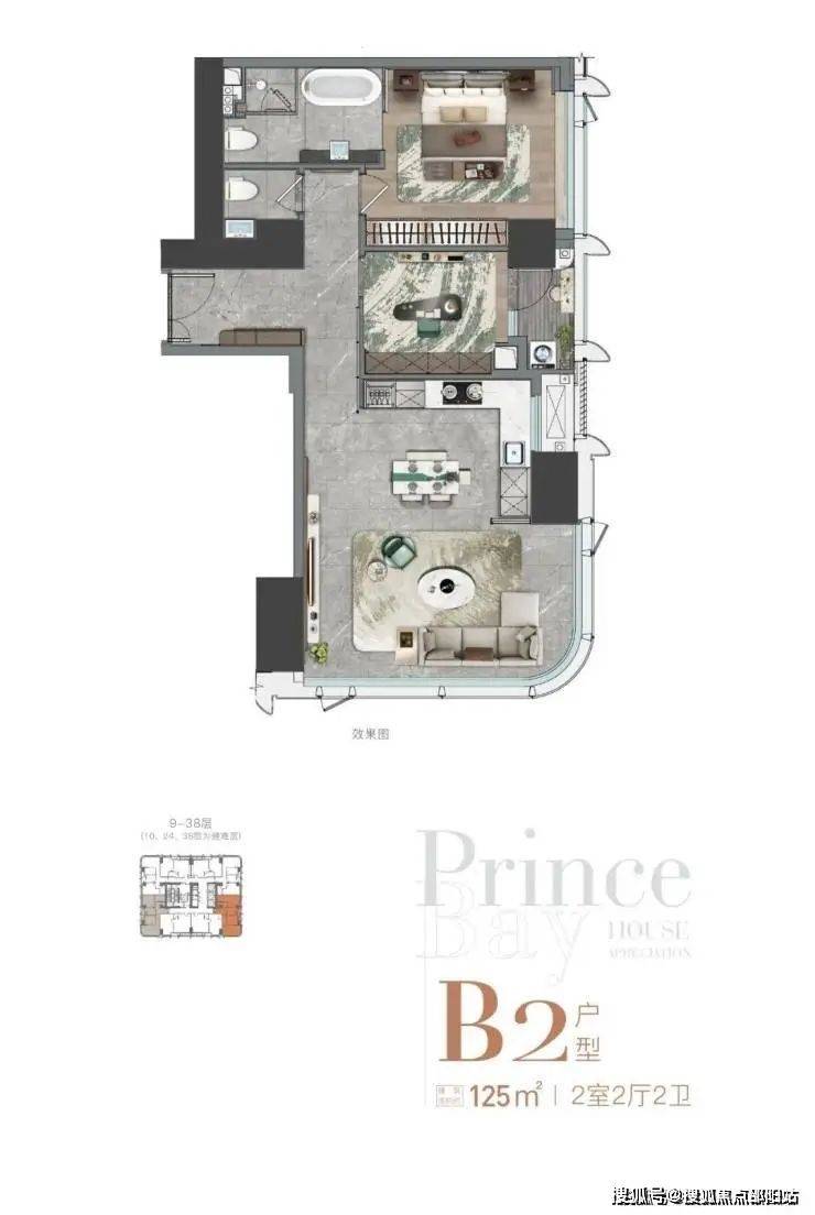 东南、西南向(9-38层) B2户型,125㎡ 2室2厅2卫,客厅也有270°弧形采光面,主卧虽没有独立衣帽间,但是有一个带浴缸的卫生间!