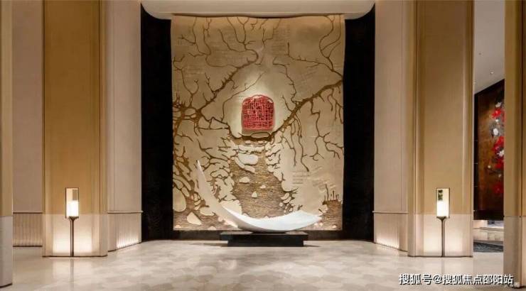 每一步都有故事,每一隅皆具巧思。入门伊始,高9米黑金奢石照壁,分5片屹立其间,含“九五至尊”之意。