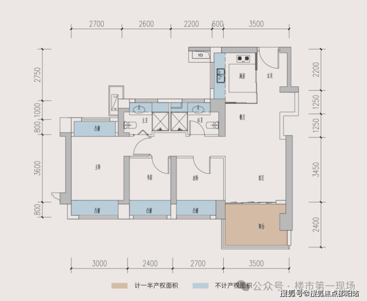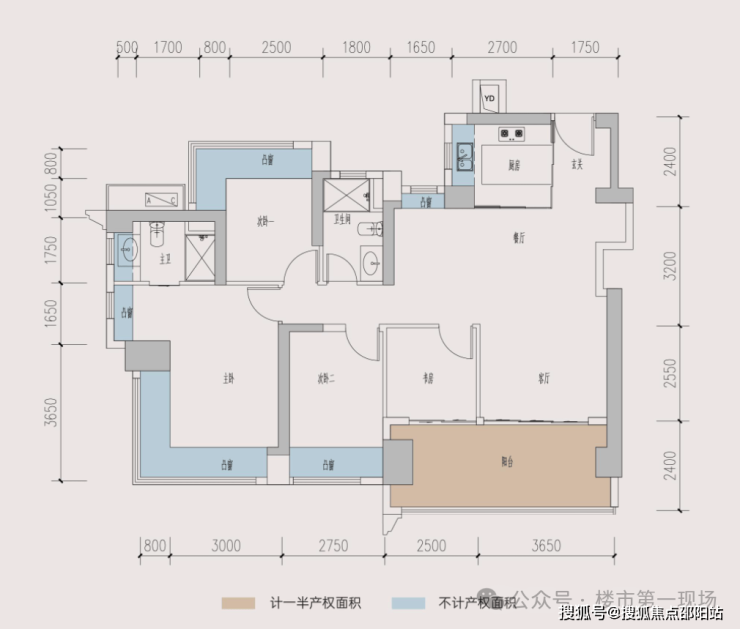 3室2厅2卫,南北通透,客餐厅5.6米宽,带11㎡阳台。主卧及次卧双飘窗,全屋12个飘窗。L型厨房,可改4房,赠送面积24㎡,得房率104.44%(含赠送)。