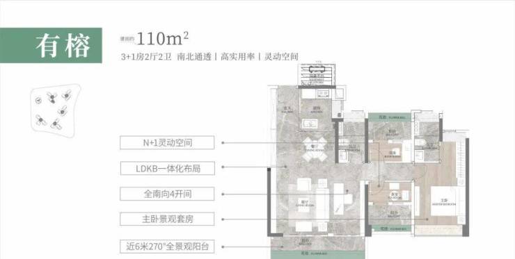 建面约110㎡,南向阳台近6米,显得很阔气,270°视野,更是难得,LDKB一体化设计,形成一个阔绰的方厅,
