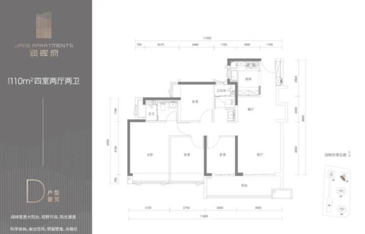 E户型是110㎡四房二卫横厅户型,则是B户型的放大版。西南朝向,户型方正,三个次卧的面积均在9平米以上,主卧18平左右。再加上双面采光对流,基本上不存在采光死角。