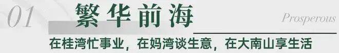 大南山生态住区项目所在前海合作区大、小南山片区西组团规划定位重点安排教育、配套、体育等公共服务设施和生活服务设施(数据来源:《中国(广东)自由贸易试验区深圳前海蛇口片区及大小南山周边地区综合规划》与【桂湾】国际金融城和【妈湾】深港国际服务城两大前海核心区引擎形成前海黄金三角,工作、生意生活尽在掌握山海通廊:约650米两个红绿灯,咫尺2.9k㎡妈湾理想城市约 53.8 公顷绿地公共空间,营造全域公园城市,宜业宜居的绿色人文之城