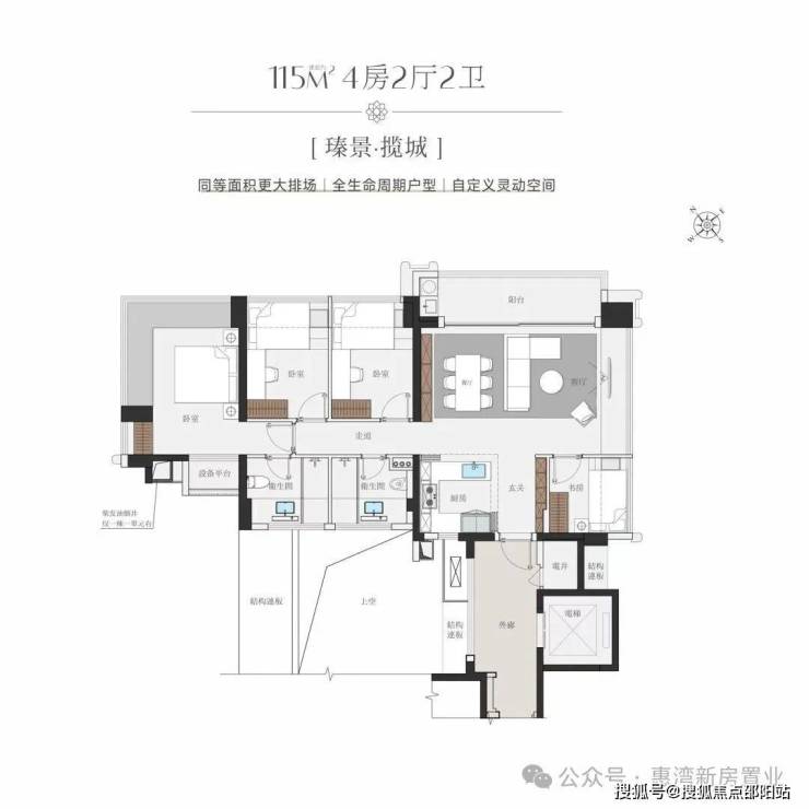 115平户型独门独户,全明独立入户电梯厅,私密又便捷,户型三面采光,主卧270度景观面,三开间朝阳,两个次卧的开间都是2.75米以上,主卧更是达到3.8米搭配270度转角飘窗。