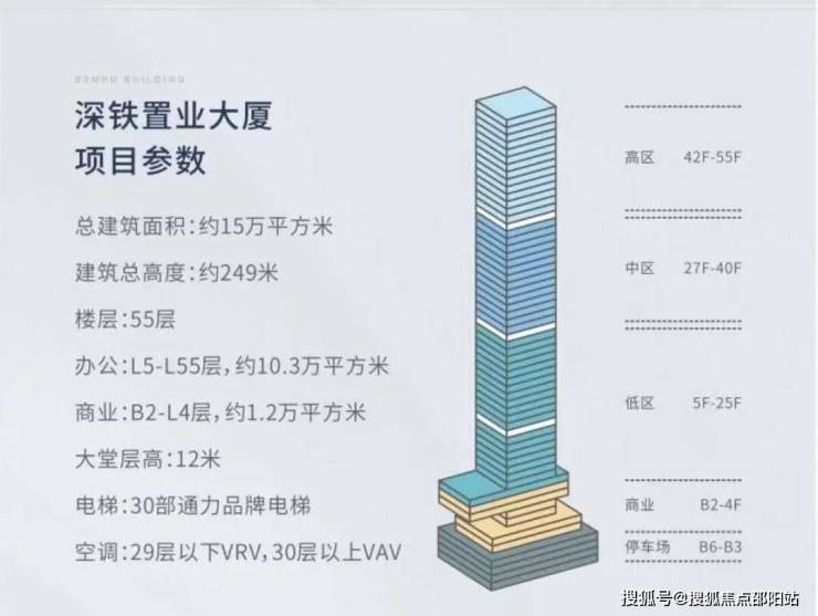 【甲级商务,品质典范】深铁置业大厦,注重品质,各项设计指标均达到甚至超越一般甲级标准。玻璃幕墙采用双层中空LOW-e玻璃幕墙,环保视野开阔;约12米双层通过大堂,20部国际品牌电梯速达目的楼层;4.4米标准层层高,8-10.2m进深,网络地板,方便实用。低区VRV高区VAV空调系统,满足企业多样化需求。物业部分已出租,投资自用皆宜。