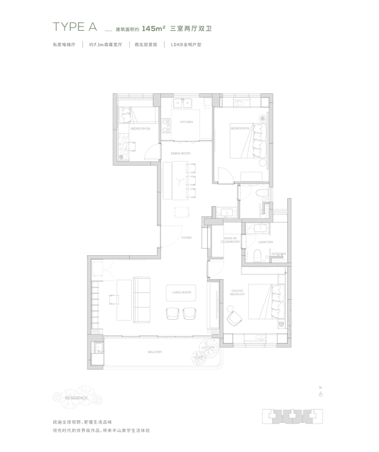 【145㎡户型】独享私家电梯厅-约7.1m²森幕宽厅-LDKB全明户型
