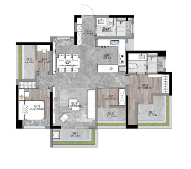 建面约115㎡四房户型,带有独立入户玄关,公共卫生间也设置在入户处,每天回家第一件事就能清洁消毒,将灰尘与细菌隔绝于室内。