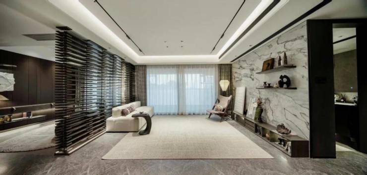 样板间将客厅与客卧打通成近50㎡的大方厅,空间十分阔绰,由于该户型的实用率高,且几乎没有走廊造成空间的浪费,室内的观感足以媲美市面上的130㎡户型,不会有哪个空间显得特别狭小。