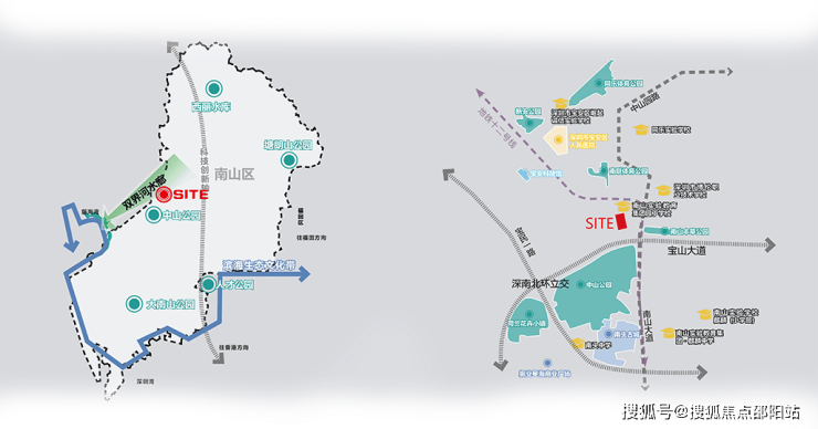 位于深圳南山区中部组团,属于粤港澳大湾区第一发展圈层,是高新技术、文化创意、文脉传承于一体的创新发展片区。场地区域位置优越,周边配套丰富,2KM 范围内有公园、学校、南头古城商圈、医院、地铁等;场地高层视线开阔,可远眺深圳湾。