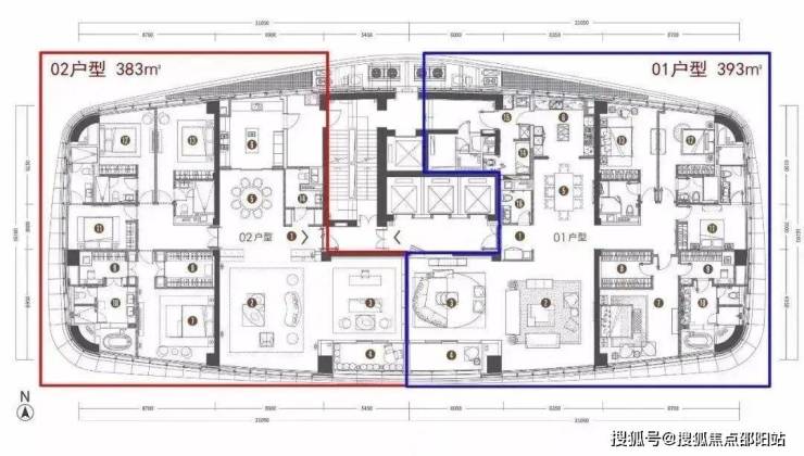 T1栋则是更加奢华的3梯1户(一层只有一户),533-540㎡