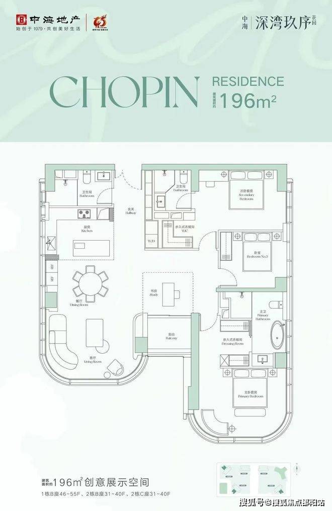 楼王户型,位于花园正中间的位置,最安静。综合实用率为78.83%,实用率最高,唯一带生活阳台的户型。专梯专户,电梯厅更大,带独立保姆间、储物间和玄关。空间尺度很足,使用功能上几乎没有缺点。中西厨餐客厅一体,朝正东或正西,多面采光。