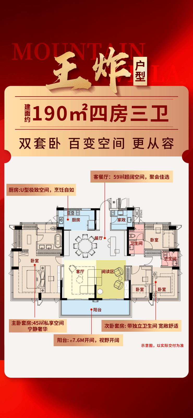 建面约190m²百变双套卧4房3卫:约59m²奢阔宽厅/约45m²奢华套卧