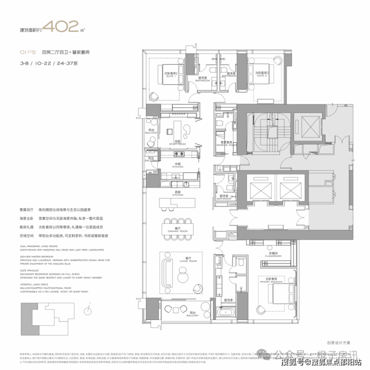 402㎡ 四房四卫-核心特点:终极改善。餐客西厨一体,三面采光,实现了主人与家政服务的“双动线”分离。