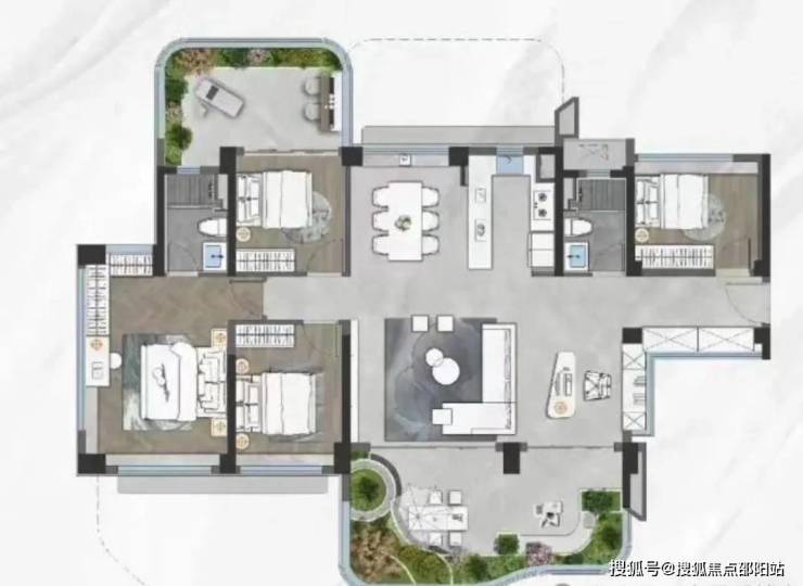 该户型把赠送面积都给了工区和主卧,全屋做到4+1房,空中花园连通公区,面积达到73㎡。最牛的是,主卧还带约14㎡的空中花园,打造一个私享庭院。