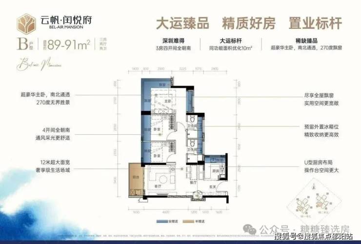 89㎡3房2厅2卫:设计的是经典横厅格局,LDKB一体化,进门入户玄关,客厅带3.5米阳台,U型厨房,主卧南北通透270度景观,卫生间干湿分离。