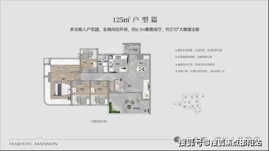 【100㎡四房两厅两卫】:西南向,使用率109%,南北通透,约6.1米巨幕阳台,主卧270°主卧弧形玻璃幕窗。