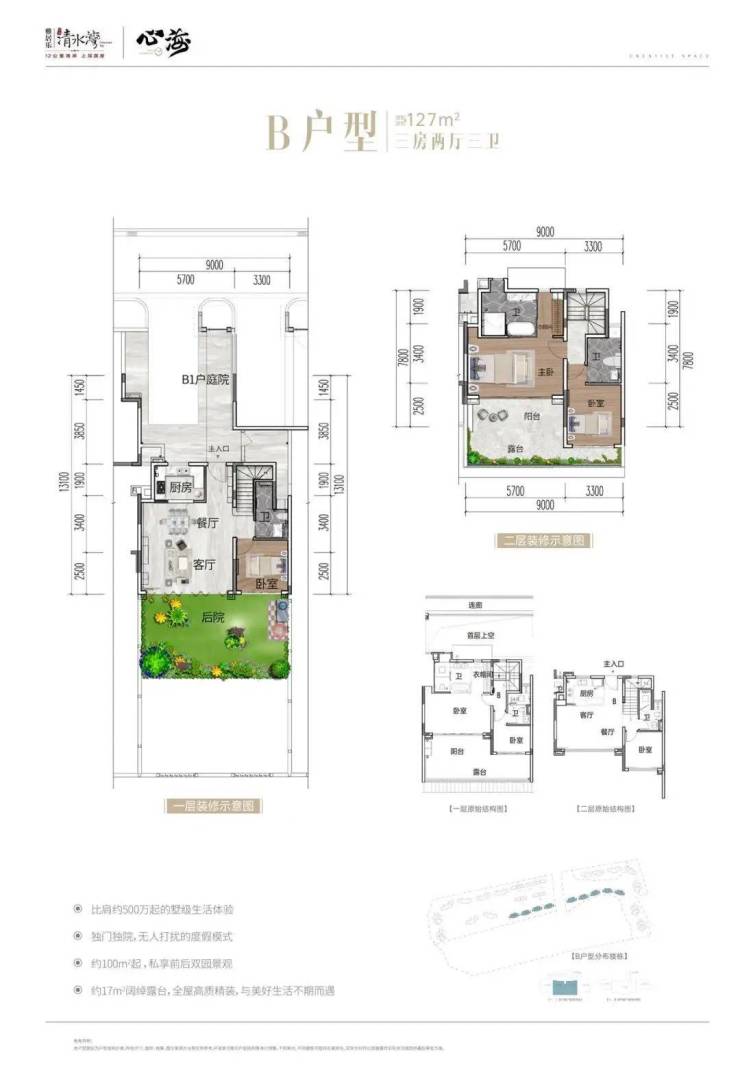 叠拼产品B户型:建筑面积约127㎡,三房两厅三卫