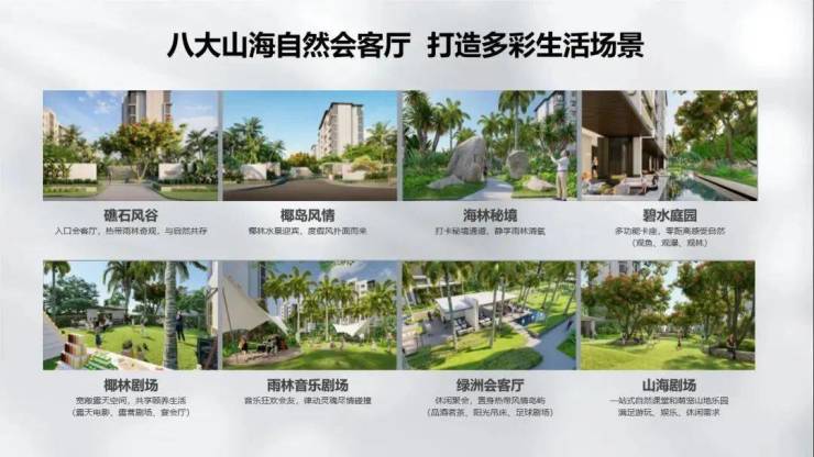 以“山与海的自然共享客厅”为设计理念,提取海风、椰林、礁石、滩涂,雨林、绿洲等滨海度假元素,规划八大山海共享自然会客厅,尽享诗意徜徉。