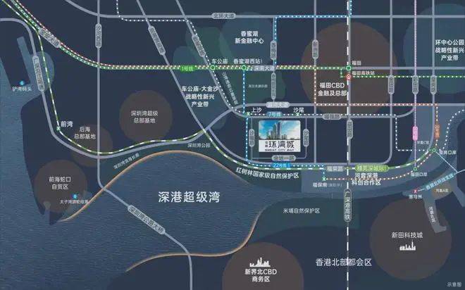 【立体交通 海陆畅达】·双地铁线:7号线双地铁口优势;22号线双地铁上沙交汇站(规划中),1站直达香蜜湖新金融中心与河套深港创新合作区。·超级口岸:皇岗口岸深度改造,深港唯一24小时陆路通关口岸,3城轨+2地铁,迅捷连通深港河套两地。·联港通沪:沪深高速磁悬浮规划,约2.5h通达沪深,链接“上广深港”南中国超级都会群。·城际轨道:全面覆盖广深科技创新走廊的穗莞深城际铁路,贯通大湾区重要科技核芯;深广中轴城际铁路,直连广深城市中心;香港北环支线,再添深港连通新轨道,便利畅达尖沙咀。