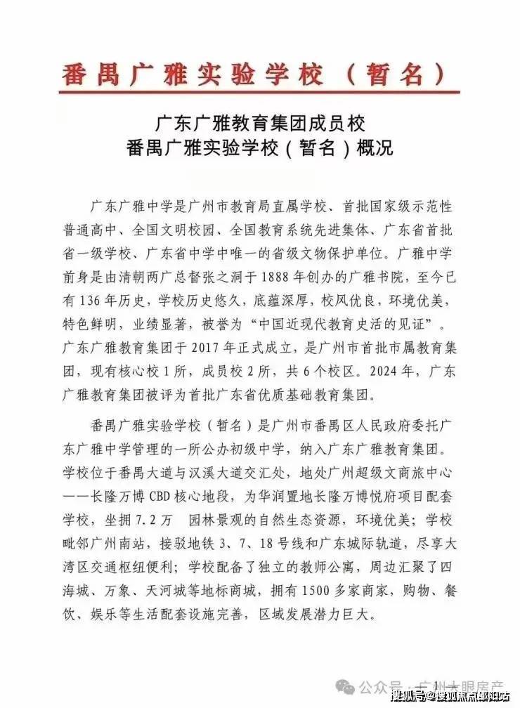 开发商也是公布了学校,小学为东风东小学(番禺东风东教育集团番禺小学),初中为广雅中学(番禺广雅实验学校),幼儿园是广东省番禺实验幼儿园,小学和初中2025年就能开学,这对业主来说无疑是个非常好的消息