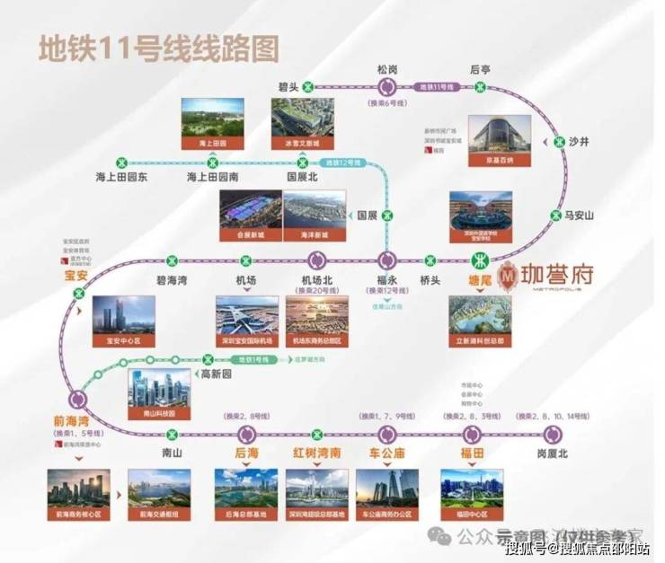 鸿荣源珈誉府位于宝安大道与凤塘大道交汇处,地处沙井核心区域。项目最大的亮点之一是与地铁11号线塘尾站无缝接驳,真正实现了地铁上盖物业的便利。从项目出发,6站可达宝安中心,7站直达前海,9站到后海,11站即达车公庙,对于在南山、福田工作的通勤族来说,位置相当便捷。