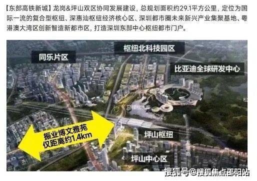 以坪山高铁站为中心发展枢纽商务、创新研发、生活服务。总规划面积约29.1万k㎡,其中龙岗16.4万k㎡,坪山12.7万k㎡,打造为深圳东部中心枢纽都市门户。