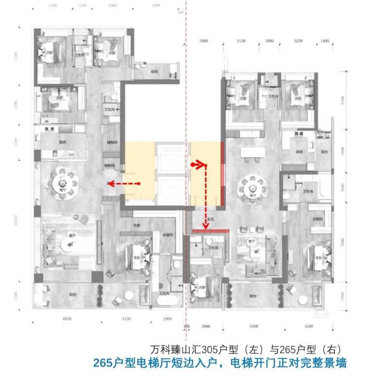 由原来的长边进入调整为短边进入,电梯开门正对一面很长的景墙,体验感和仪式感要比隔壁305的更好。同时,调整后,形成独立的玄关,避免开门煞。