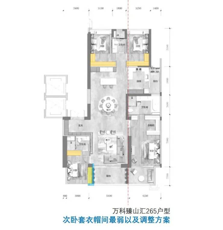 整个客-餐厅深度达到了13.4米,与隔壁305户型客-餐-厨共同的深度13.8米相当,别忘了265户型还有一个面积并不小的独立中厨空间。超深的客餐厅,让顾客有更多的使用场景的可能。官方给出的答案是客厅+餐厅+西厨岛台,个人觉得这样一个答案把厨房的占比提高的太多,相信客户会结合自己的需求给出自己更好的答案。