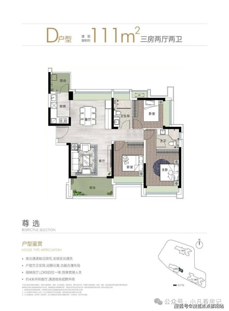 设计的是竖厅南北通透格局,进门入户玄关,客厅3.9米开间,LDKB一体化设计,动静分区,3个卧室分别做到了主卧16m/次卧12.3m/次卧9.56m(包含墙体飘窗),L型厨房还带1个小生活阳台,卫生间干湿分离,得房率约79.24%(不含赠送),东北朝向。