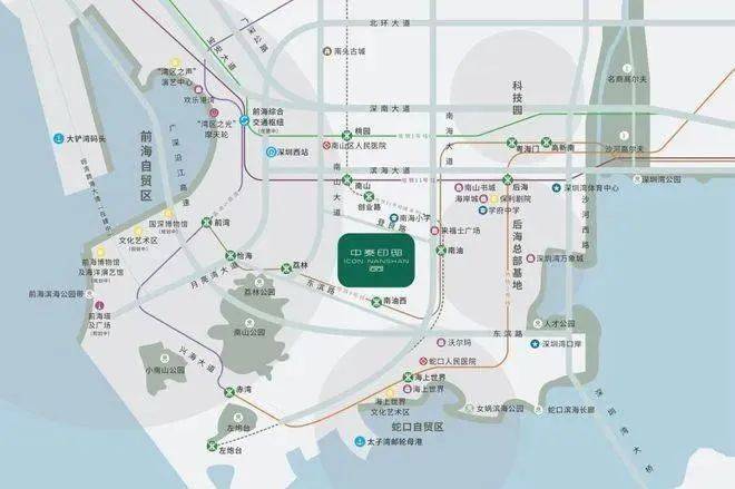1站前海、1站蛇口、4站科技园,出门就是南山大道,驾车15分钟可达南山科技园;驾车通过滨海大道约20分钟抵达深圳湾超总基地;驾车经东滨路向西约15分钟可以大道前海;驾车向南走经南海大道约10分钟到蛇口中心或约25分钟可达香港。