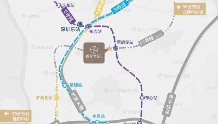 项目位于 5/17 号(规划中)百鸽笼站双地铁线上盖,1 站换乘 3/14 号线,4 站抵达福田芯,高效串联南山 / 前海,1 站直达深圳东站,7 站快速通达深圳北站。