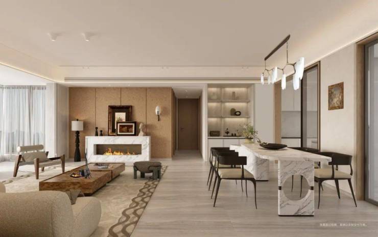 约5.8米巨幕阳台+L型飘窗组成IMAX级270°环幕观景台,晨起观江岸潮生,暮色里执杯赏CBD天际线流转,更可邀友于云端品茶对弈。