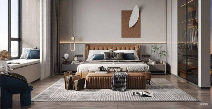 主卧套房同样借鉴酒店打造灵感,奢享L型全景飘窗+独立衣帽柜,让每一次起居皆成为奢享仪式。