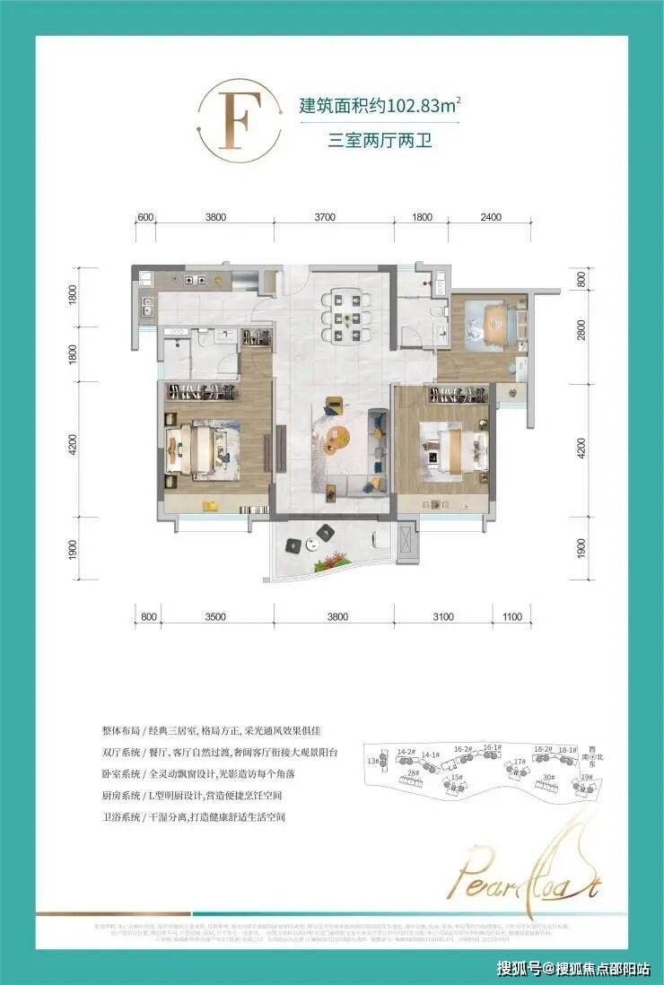F户型-建筑面积约102㎡ 三室两厅两卫:餐客厅一体化,L型明厨设计