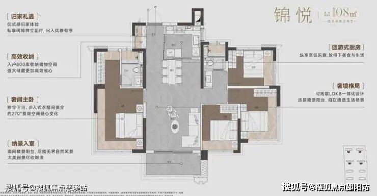 首推的6栋,中间是南向的108㎡户型,4开间南向,入门西侧是全功能主卧套房,中间是LDKB一体化客餐厨空间+大阳台,东侧是3房设计(可改为大2房)