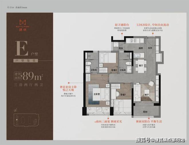 89㎡三房二卫C/D/E户型,位于2栋一单元,双阳台,小卧室还有厨房对凹槽采光。