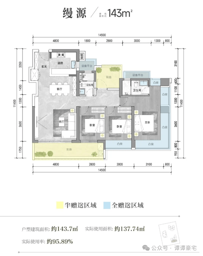 3、南山新规,含赠送使用率约96%,约105平米2+1空间(可改3+1空间),约5米开间超大客厅,270度主卧飘窗,国内外一线品牌精装交付;
