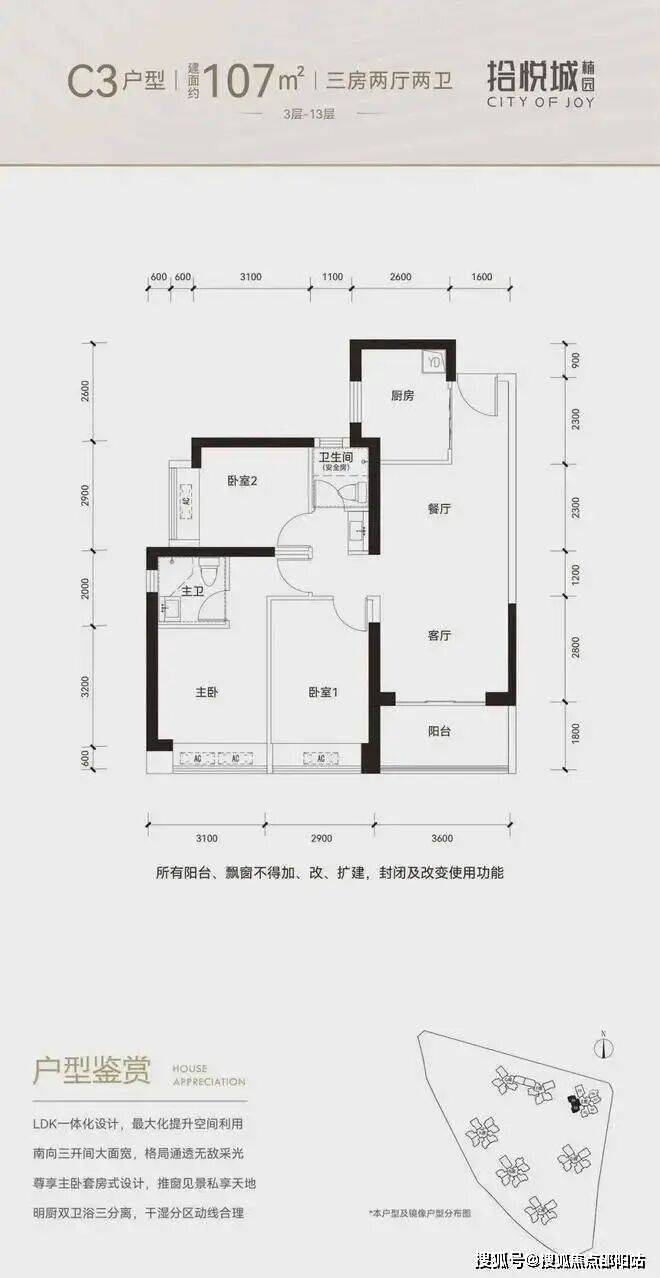 100平三房:设计的是竖厅格局,进门入户玄关,客厅3.4米开间,LDKB一体化设计,3个卧室分别做到了3米/2.9米/2.5米的宽度,U型厨房,公卫三段式分离,得房率:77.14%(不含赠送),阳台1.8米宽度,西南或东南朝向。